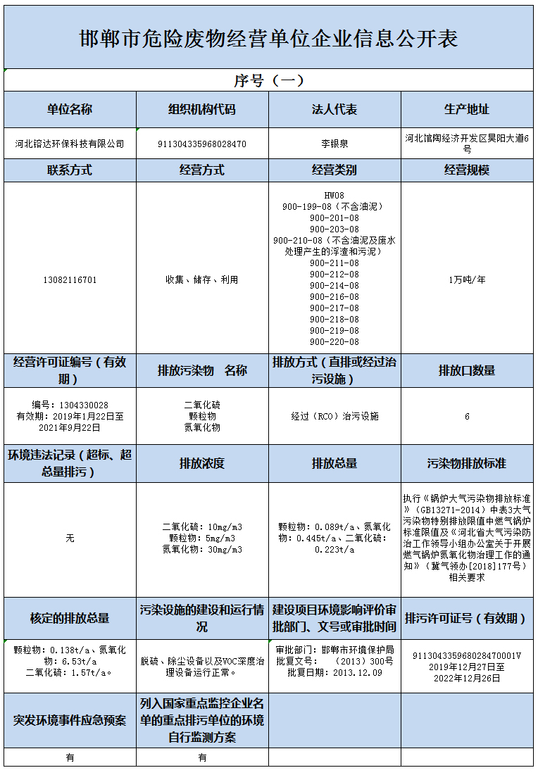 邯鄲市危險(xiǎn)廢物經(jīng)營(yíng)單位企業(yè)信息公開(kāi)表